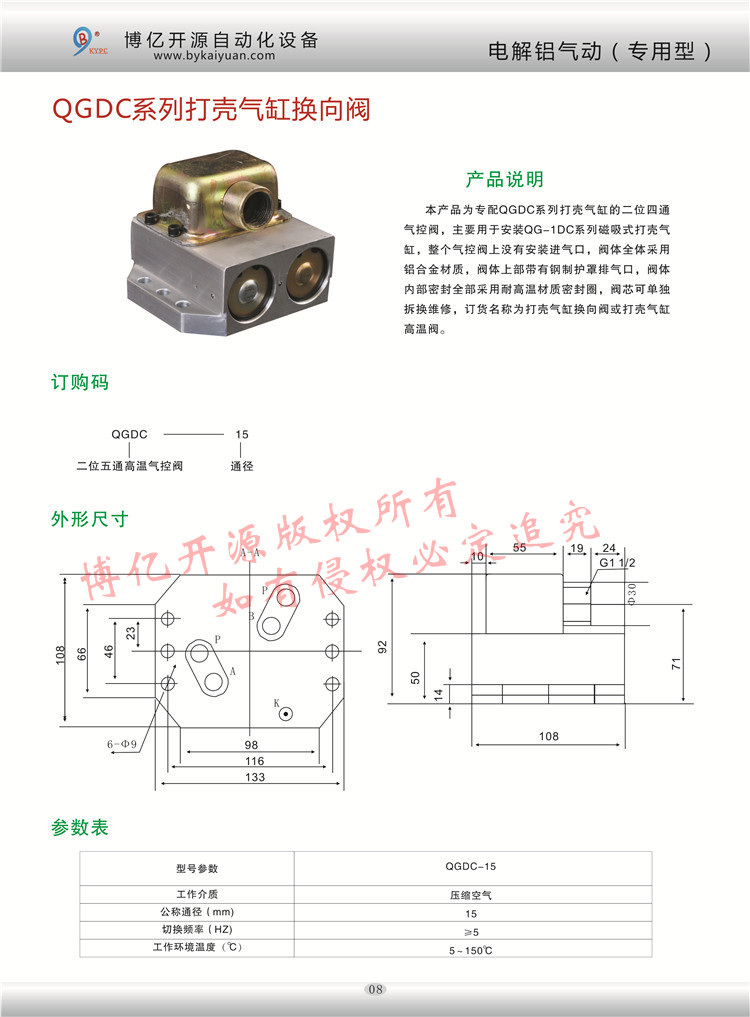 本品為專(zhuān)配肇慶型電解槽打殼氣缸氣動(dòng)控制閥頭,整閥為兩位五通氣動(dòng)控制,我公司把動(dòng)力進(jìn)氣口G1/2改成了由G1/2和G3/4兩種款式,有效的解決了氣缸速度慢壓力小的弊端,更多的技術(shù)咨詢(xún):0371-85612788。