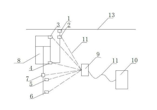 如圖所示,本新型電解槽用智能打殼氣缸包括設(shè)置在電解槽加料口上方的活塞桿端連接有打殼錘頭7的打殼氣缸8,打殼氣缸的兩個進出氣口通過管路分別與兩位五通電磁閥2的相應(yīng)接口相連,兩位五通電磁閥2通過減壓閥1與壓縮空氣總管13相連接;在打殼氣缸的兩個進出氣口處分別設(shè)置有壓力傳感器3、4,在打殼錘頭伸縮運動的上、下行程止點處分別設(shè)置有限位開關(guān)5、6 ;壓力傳感器、限位開關(guān)、減壓閥以及兩位五通電磁閥的控制接口均通過連接電纜11與PLC控制器的相應(yīng)接口連接,PLC控制器通過連接電纜11與槽控機通訊連接。
