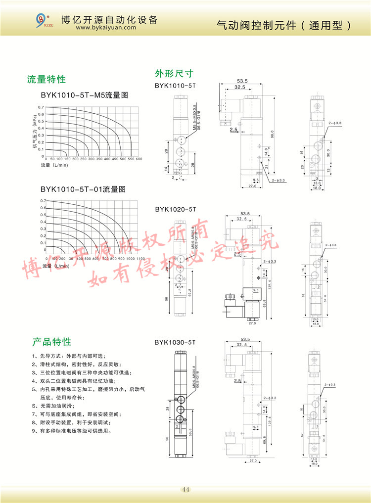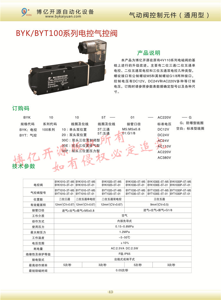 BYK/BYT100系列電控氣控型號有M5接口和一分接口的二位三通、二位五通、三位五通單電控,雙電控的各種電壓控制,更多的技術咨詢請聯(lián)系本公司技術部:0371-85612788。