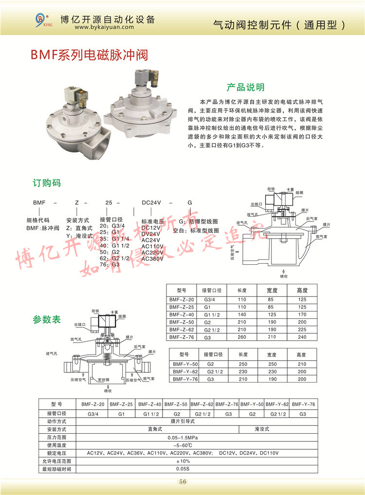 產(chǎn)品描述 【產(chǎn)品名稱】:BMF系列電磁脈沖閥 【產(chǎn)品型號(hào)】:直角式、淹沒式 【產(chǎn)品介紹】:本產(chǎn)品為博億開源自主研發(fā)的電磁式脈沖排氣閥,主要應(yīng)用于環(huán)保機(jī)械脈沖除塵器,利用該閥快速排氣的功能來對(duì)除塵器內(nèi)布袋的噴...