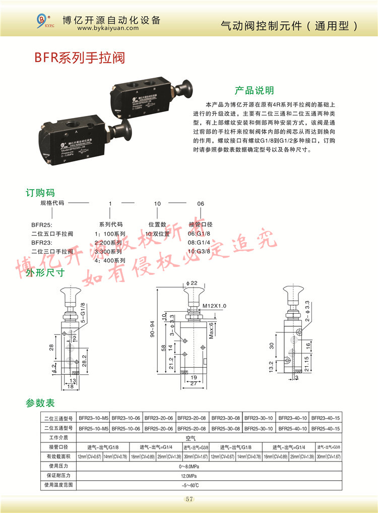 BFR系列手拉閥主要分為二位五通和三位五通手動(dòng)控制閥,該閥是通過(guò)后部手推桿來(lái)控制閥體內(nèi)部的閥芯從而達(dá)到換向的作用。訂購(gòu)電話:0371-85618561。